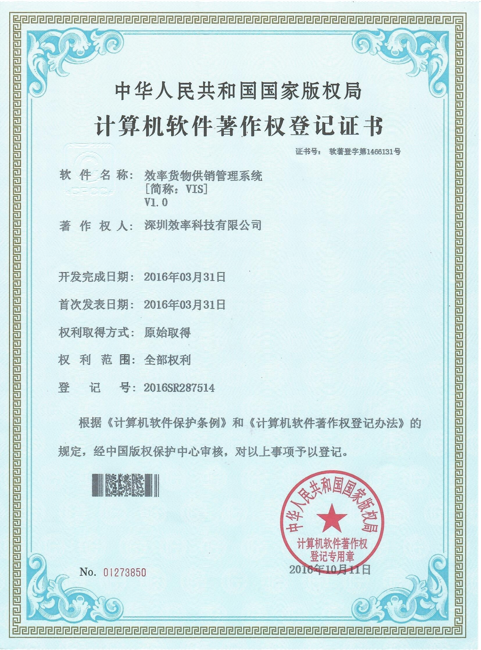 VIS貨物供銷系統(tǒng)軟著證書